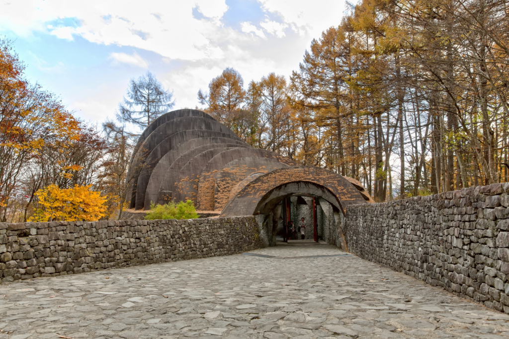 Among Karuizawa’s most iconic architectural landmarks is the Stone Church (Uchimura Kanzō Memorial), located in the Hoshino Area. Built from curved stone and glass, the church allows natural light to flow through its arches, creating a mystical and organic atmosphere. It reflects a philosophy of harmony between people and nature and is widely regarded as one of Japan’s most romantic wedding venues.